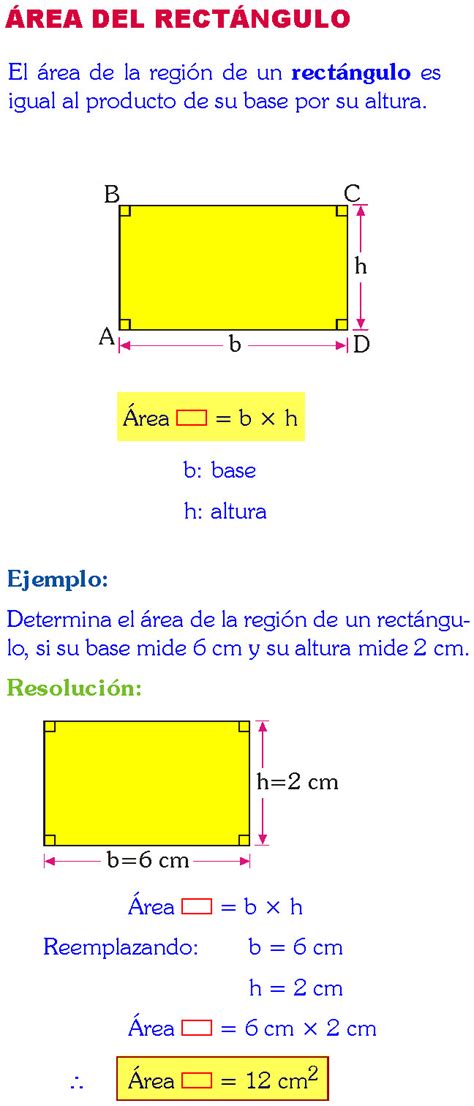 El área de un rectángulo es un concepto fundamental de geometría que se enseña en la escuela primaria. El área de un rectángulo se calcula multiplicando la longitud por el ancho. Esto significa que el área se mide en unidades cuadradas. Por ejemplo, si un rectángulo tiene una longitud de 3 metros y un ancho de 4 metros, el área del rectángulo será de 12 metros cuadrados.